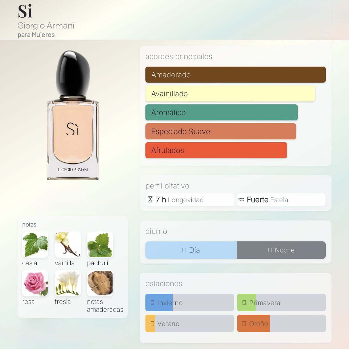 Si de Giorgio Armani es una fragancia de la familia olfativa Chipre Frutal para Mujeres. La Nota de Salida es casis (grosellero negro); las Notas de Corazón son rosa de mayo y fresia; las Notas de Fondo son vainilla, pachulí, notas amaderadas y ambroxan.